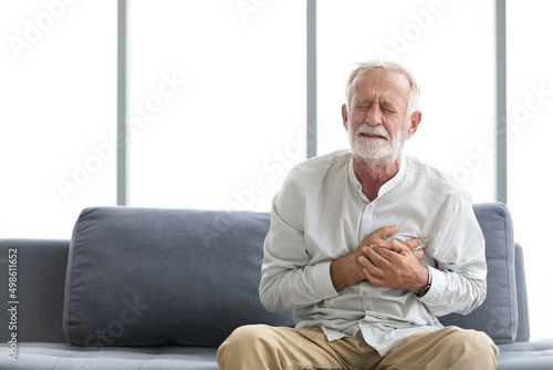 senior elderly man chest pain or suffering from heart attack on a sofa