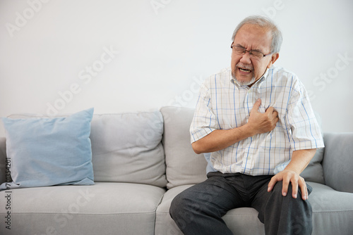 senior elderly man have a chest pain or suffering from heart attack on a sofa