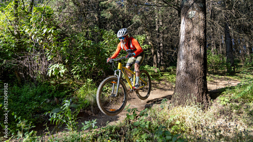 adrenalin, athlete, concentration, bicyclist, daytime, effort, exercise, expert, extreme, forest, full body, jumping, lifestyle, long shot, morning, mountain bike, nature, outdoors, professional, rider, riding, root, routine, skill, sport, sporty, sunny, track, trail, tree, wood, physical exercise