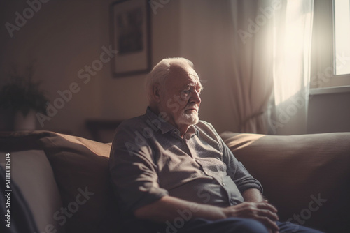 Senior grandfather sitting in the living room on the sofa couch, feeling nostalgic, pain, missing his grandchildren, bankruptcy, and fraud at home. Generative AI