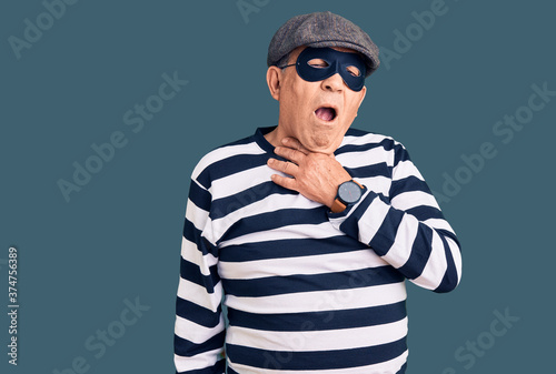 Senior handsome man wearing burglar mask and t-shirt touching painful neck, sore throat for flu, clod and infection