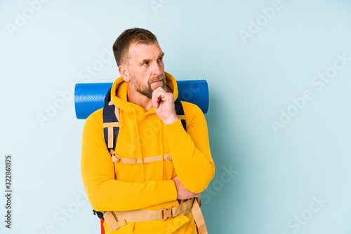 Senior hiker man isolated on blue background looking sideways with doubtful and skeptical expression.