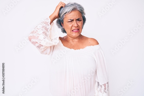 Senior hispanic grey- haired woman wearing casual clothes confuse and wonder about question. uncertain with doubt, thinking with hand on head. pensive concept.