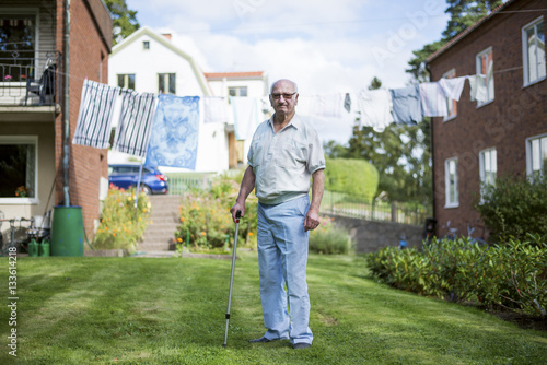 residential area, people, clothes line, man, crutch, lawn, old, house, home, residential house, adult, building, grass, laundry, outdoors, standing, full-length, horizontal, 1, day, colours, front view, real people, apartment building