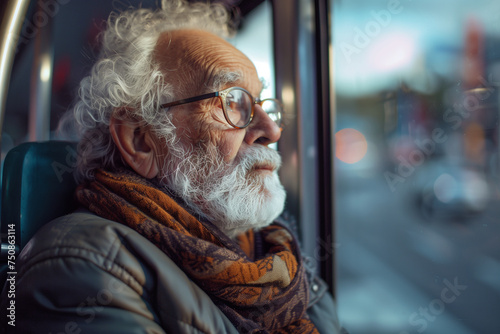 elderly, man, city, life, bus, window, contemplation, thoughtful, expression, white, beard, senior, citizen, public, transport, urban, scene, reflective, mood, aged, wisdom, eyeglass, foulard, mature, adult, pensive, traveling, passenger, real, people, candid, streetscape, mobility, journey, daydreaming, solitude, life events, individuality, city landscape, blurred, motion, deep, profile, view, alone, looking, away, winter, attire
