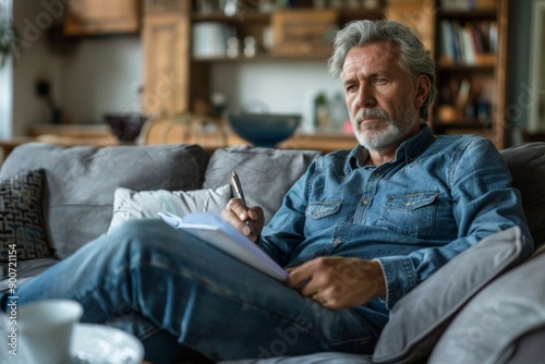Senior man in denim shirt sits on couch, deeply focused on writing in a notebook. Cozy and relaxed home environment. Captures simplicity of daily routine. Perfect for lifestyle or editorial content