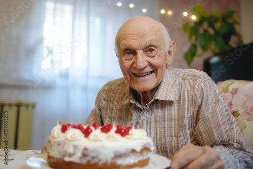 birthday, cake, celebration, senior, man, home, happiness, family, dessert, cherry, elderly, joyful, milestone, party, gathering, cooking, sweet, treat, indoor, smiling, tradition, decoration, warmth, love, memory, honoring, age, baked, good, white, frosting, candle, festive, special, occasion, togetherness, personal, cheerful, nostalgia, light, colourful, friends, community, setting, intimate, decor, generative, ai, sitting