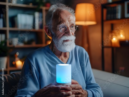 elderly, senior, man, old, mature, grandfather, grandparent, pensioner, older, beard, hot drink, mug, cup, drink, technology, smart, device, tablet, monitor, health care, medicals, independent, living, assistant, reminder, health, concept, lifestyle, home, interior, cosy, relaxing, comfortable, modern, indoor, furniture, sofa, armchair, reading, enjoying, calm, thoughtful, contemplative, intelligent, futuristic, digital, innovative, connected