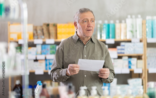 Senior man with a medical prescription stands near a counter with medicines and pills in a European pharmacy