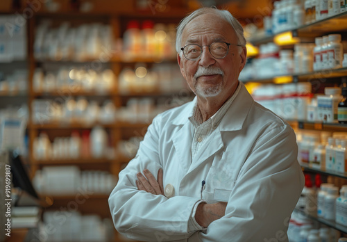 Senior pharmacist smiling confidently in a busy pharmacy with shelves of medicine