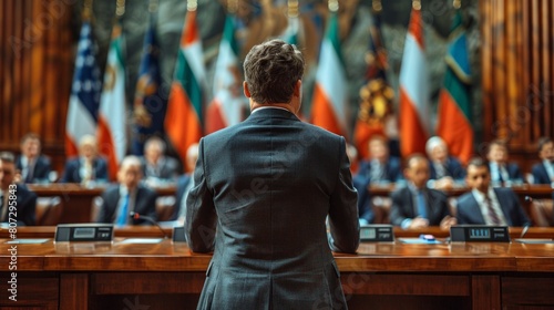 Senior Political Leader Addressing an International Assembly with Flags in the Background