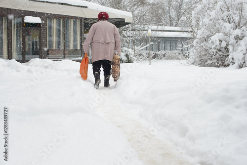 now, winter, elderly, person, walking, path, boot, coat, shopping, bag, weather, cold, covered, glacé, heavy, seasonal, road, morning, effort, street, movement, travel, destination, cold weather