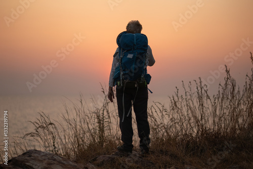 Senior woman is hiking outdoors, enjoying nature expression looks into the distance observing and possibly guide trekking and trail ecotourism adventure concept.