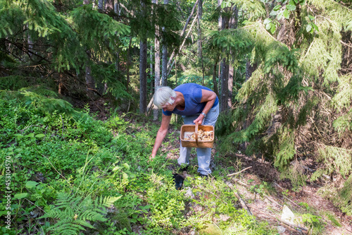 leisure, summer, forest, pecking, people, old, chanterelle, mushroom, horizontal, outdoors, day, looking down, front view, standing, bend, grey-haired, short hair, woman, 1, basket, colours, full-length, real people