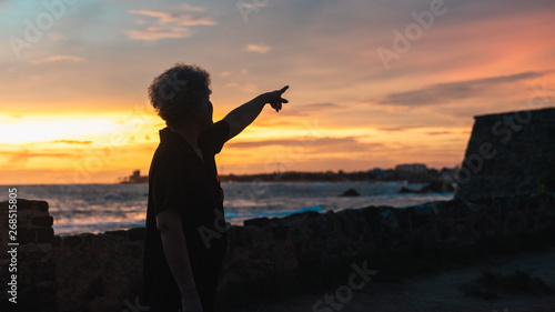 Senior woman pointing at sunset in Galle Fort, Sri Lanka
