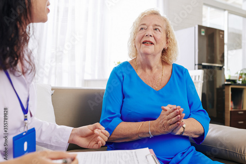 Senior woman talking to doctor who visits her at home and writing down prescription