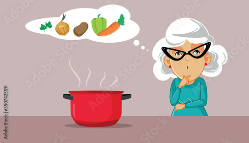 Senior Woman Thinking about Making a Vegetables Soup Vector Cartoon. Granny trying to remember all the ingredients for her homemade mea