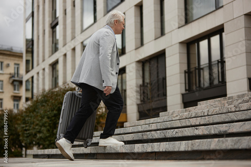 senior, woman, suitcase, moving, step, near, building, street, 1, people, travel, adult, man, journey, female, outdoors, day, leisure, wheeled, baggage, exterior, architecture, white hair, holiday maker, tour tourism, road, holding, caucasian, vacation, lifestyle, weekend, staircase, stair, male