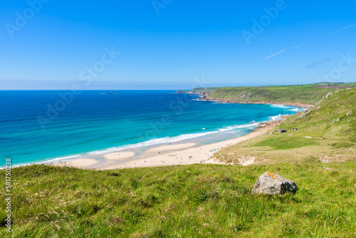 Sennen Cove beach and Cape Cornwall, beautiful bay with crystal clear turquoise water. Popular spot for surfing. England, UK.