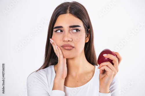 eating, holding, pain, teeth, adult, background, beauty, biting, care, facial expression, female, food, freshness, fruit, healthy eating, healthy lifestyle, horizontal, human face, disease, people, photo, problem, red, surprise, symptom, toothache, white color, woman, young adult, touching, missy