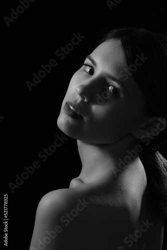 woman, beauty, fashion, beautiful, studio, model, monochrome, portrait, elegance, expression, sensual, female, party, gorgeous, face, background, style, makeover, posing, light, girl, vogue, lady, intense, glow, young, brunette, aesthetic, seductive, passion, glance, caucasian, make-up, serious, bare, vertical, closed, eye