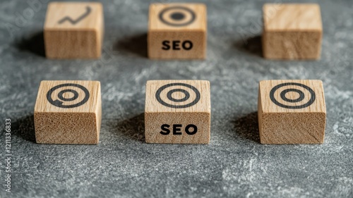 seo relevance Concept. The image features wooden blocks with SEO-related symbols and text, arranged on a textured surface, representing digital marketing concepts.