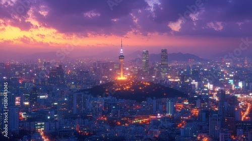 Seoul Cityscape at Dusk with Namsan Tower and Skyscrapers
