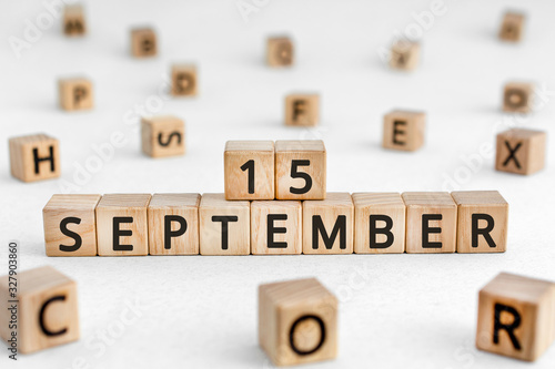 September 15 - from wooden blocks with letters, important date concept, white background random letters around