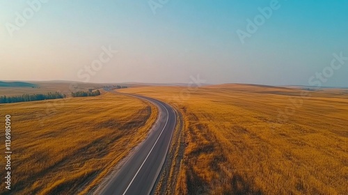 Serene Aerial View of Curved Road Through Golden Wheat Fields