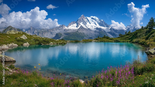 Serene alpine lake reflects snow-capped mountains under vibrant blue sky with fluffy clouds