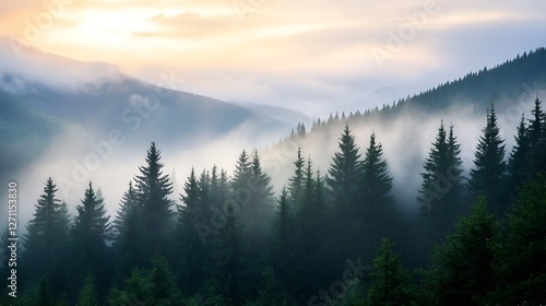 Serene and Misty Forest Landscape at Sunrise in the Mountains with Evergreen Trees and Fog : Generative AI