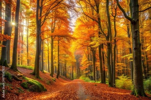 Serene autumn forest scene with tall trees covered in vibrant orange and yellow leaves. Pathway bathed in golden sunlight. Tranquil atmosphere captures beauty of fall foliage in nature