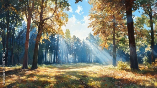 Serene autumn landscape enchanted forest nature photography golden hour wide angle tranquility and beauty