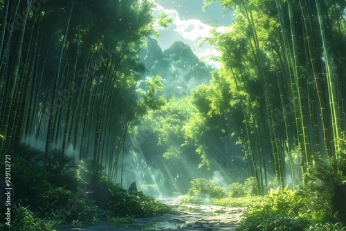 nature, forest, bamboo, landscape, scenic, tranquil, serene, zen, sunlight, dappled, light, green, lush, foliage, tree, leaf, path, trail, environment, natural, scenery, atmosphere, peaceful, relaxing, calming, beauty, paradise, idylli, dreamlike, fantasy, mystical, magical, wonder, aethereal, mist, fog, hazy, mystique, enchanting, verdant, emerald, jade, pristine, untouched, remote, hidden, secluded, solitude