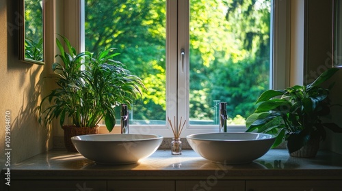 bathroom, interior, serene, setting, natural, light, sink, bathtub, plant, modern, design, clean, space, daylight, contemporary, decor, minimalist, style, home, pot, window, view, well, lit, zen, atmosphere, green, relaxing, environment, empty, calm, soothing, ambience, item, daytime, spa, like, bathe, countertop, fixture, simple, elegant