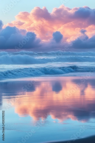 beach, sunset, cloud, sand, water, ocean, wave, sky, pink, blue, horizon, coastline, scenic, landscape, nature, tranquil, serene, calm, peaceful, beauty, coastal, shore, tide, wet, light, soft, pastel, dreamy, aethereal, idylli, picturesque, vibrant, colourful, majestic, huge, open, clean, clear, pristine, natural, fresh, bright, wide, expansive, quiet, solitude, stillness
