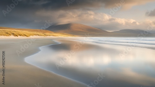 beach, ocean, sea, sand, dune, mountain, sky, cloud, sunset, sunrise, water, calm, peaceful, tranquil, serene, landscape, nature, scenery, coast, shoreline, wave, horizon, light, gold, yellow, dramatic, beautiful, picturesque, scenic, travel, holiday, vacation, get-away, relaxation, solitude, wilderness, environment, photo, image, picture, view, panorama