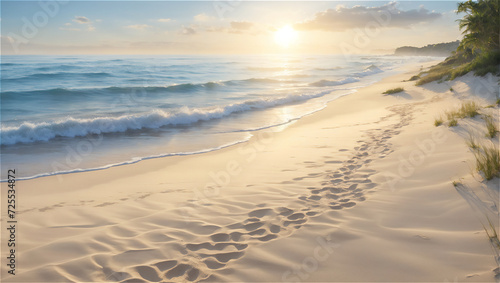 Serene Beach Scene With Footprints on Sandy Shore Under a Cloudy Sky at Midday