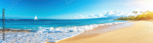 beach, ocean, wave, sailboat, sky, sand, palm, tree, tropical, sunny, horizon, seascape, coastline, vacation, travel, relaxation, nature, landscape, blue, water, summer, scenic, tranquil, idylli, paradise, outdoors, shore, sunlight, peaceful, cloud, island, get-away, leisure, marin, adventure