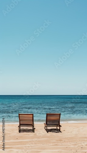 Serene beachside scene two lounge chairs on soft sand with tranquil sea and clear sky