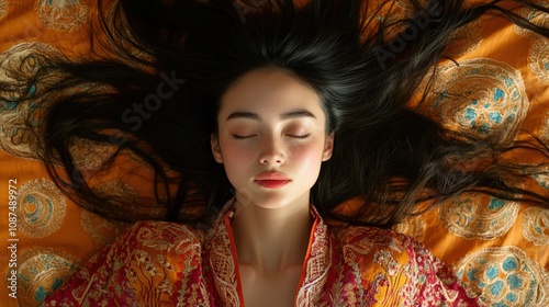 beauty, serenity, woman, portrait, calmness, orange, fabric, elegance, long hair, calm, ethnic, stylish, relaxation, youth, fashion, mood, wellness, accessory, harmony, vibrant, closeup, peaceful, cultural, artistic, natural beauty, indoor, intimate, zen, contemplation, overhead, luxe, lifestyle, femininity, expression, portraiture, softness, fashion design, bohemian, aesthetic, natural light, creative, diversity, peacefulness, emotional