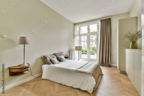 bedchamber, interior, modern, serene, tranquil, bedding, window, minimalistic, decor, peaceful, retreat, contemporary, home, soft, elegant, furniture, wooden floor, herringbone, curtain, plant, vase, lamp, wall-mounted, nightstand, pillow, sheet, comfort, style, chic, cosy, bright, roomy, residential, simplicity, light, calm, inviting, design, architecture, stylish, natural light, clean