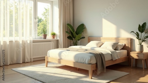 Serene Bedroom Sanctuary Light-filled Room with Minimalist Wooden Bed and Natural Decor