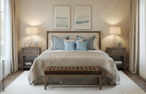 bedchamber, bed, bedding, pillow, blue, beige, wooden, furniture, lamp, artwork, art, painting, serene, calm, tranquil, peaceful, cosy, comfortable, elegant, sophisticated, luxury, interior, design, home, house, decor, style, room, space, comfort, relaxation, sleep, rest, quiet, contemporary, modern, classic, traditional, cushion, headboard, bench, rug, floor, curtain, window, light, soft, neutral