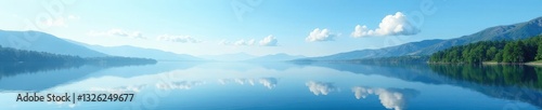 Serene blue lake, tranquil surface reflecting sky, horizon, landscape