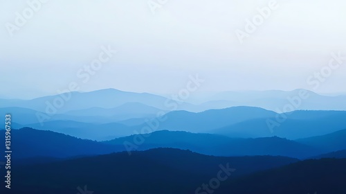 Serene blue mountain range at dawn, layered peaks fading into mist.