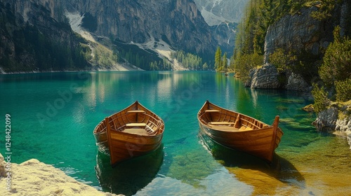 Serene Boats on Braies Lake Surrounded by Towering Dolomite Mountains in a Tranquil Setting