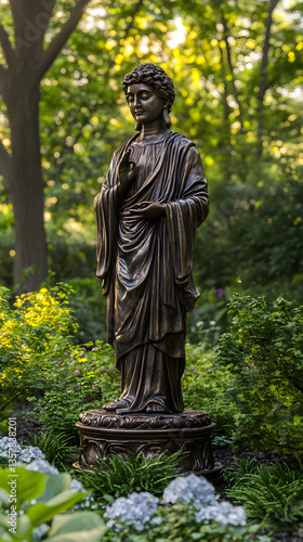statue, bronze, sculpture, garden, greenery, flower, calmness, harmony, serenity, peaceful, nature, contemplation, art, elegance, aesthetic, drape, visage, illumination, sunlight, tree, pose, dignity, integration, balance, serene, majestic, intricate, detail, design, beauty, craftsmanship, robe, tranquil