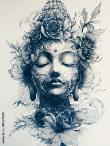 Serene Buddha with Roses: A detailed pencil sketch, depicting a serene Buddha face adorned with intricately drawn roses and floral elements in shades of blue.