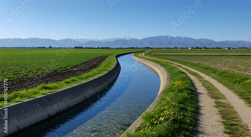 Serene Canal Flowing Through Green Fields with Distant Snow Capped Mountains under a Clear Blue Sky in Idyllic Rural Landscape